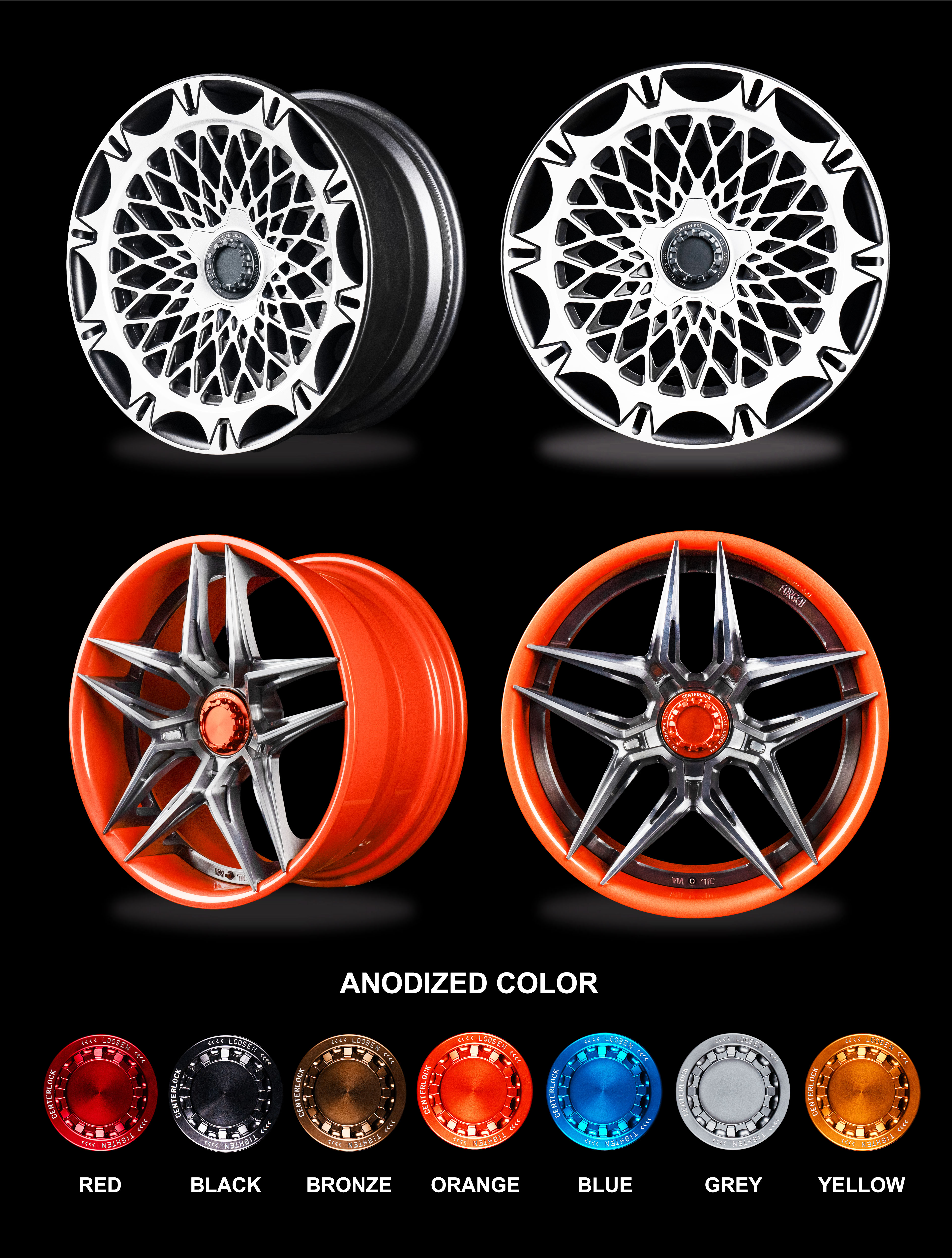 There are 7 anodized colors on the outside nut for option (yellow, black, red, orange, grey, blue, bronze). For the center ornamental bolt, customers can choose any color they desire based on the wheel color to do the painting.